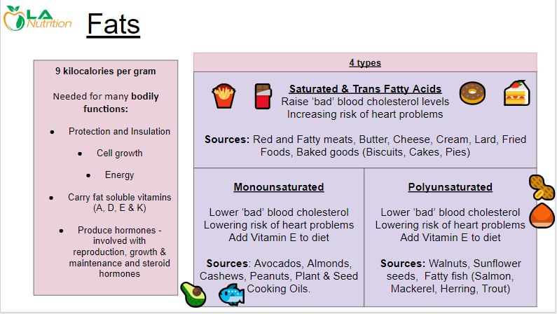Saturated and Trans Fatty Acids – are the ‘’bad’’ fats, as they raise cholesterol levels, increasing your risk of heart disease and stroke. Monounsaturated and Polyunsaturated – ‘’good’’ fats – which lower ‘’bad’’ cholesterol in the blood, and lower your risk of heart disease and stroke.