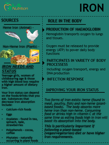 Iron is required for the production of haemoglobin – a protein found in red blood cells (RBCs) which help with breathing & energy production.