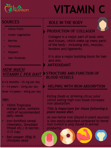 Vitamin C – also known as ascorbic acid, can be found in: broccoli, cauliflower, kale, kiwi, bell peppers, sweet potato, strawberries, tomatoes, oranges & orange juice. It is important that w get enough in our diet because it is required for :